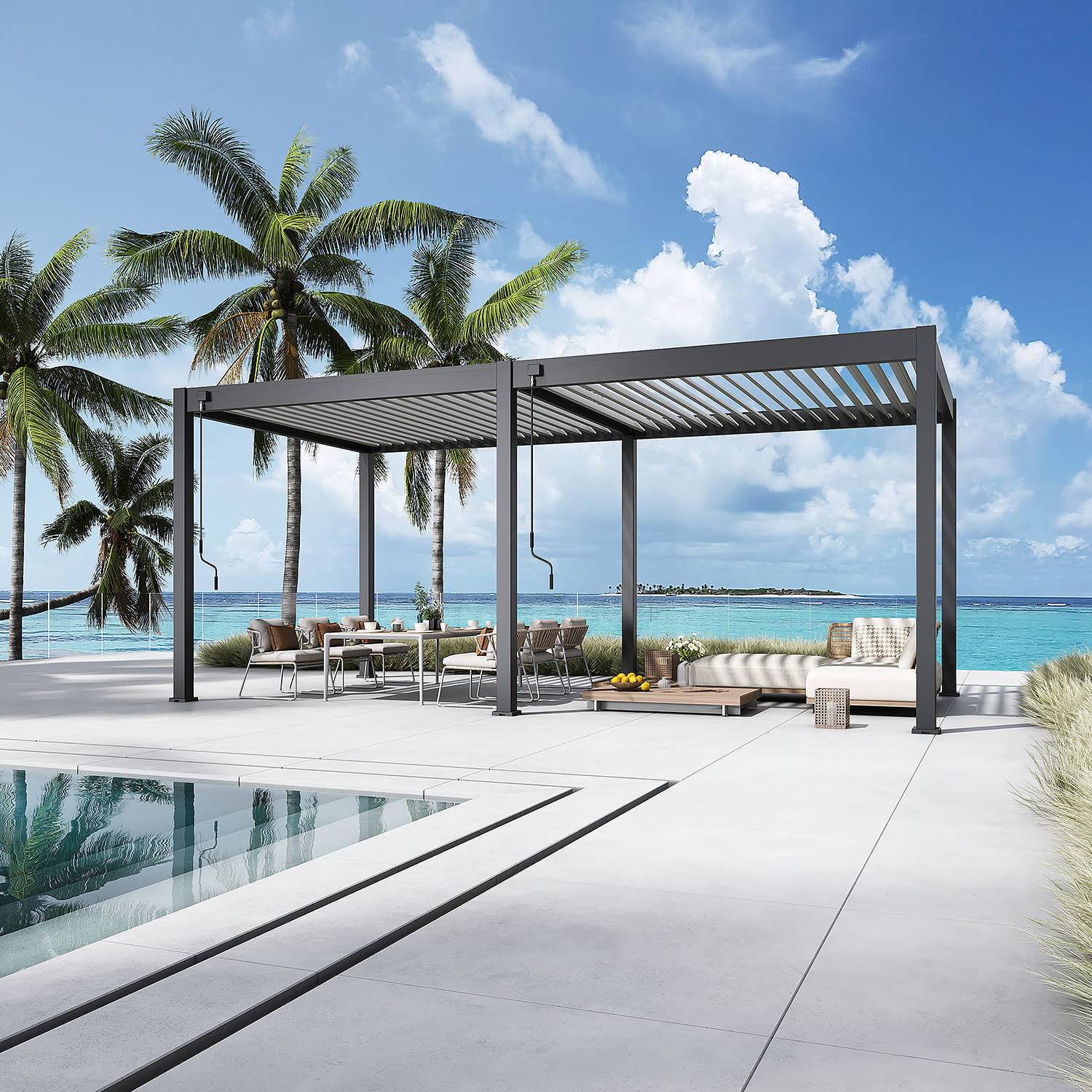- Alle Orion overkappingen zijn voorzien van een verhoogde ligger, hierdoor blijven de lamellen volledig uit het zicht, zelfs wanneer het dak geopend is.